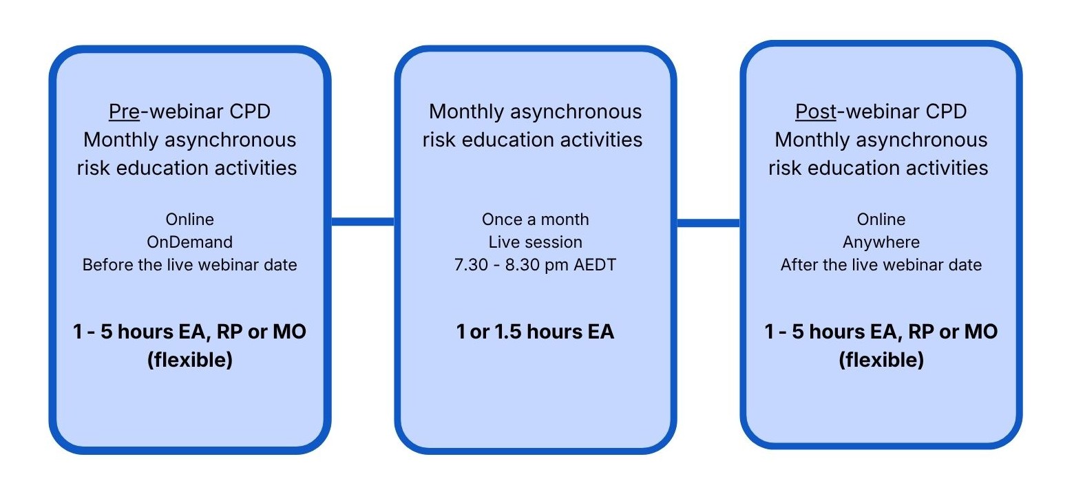 The amount of CPD per micro-credential will vary based on the type of content to be covered in each live risk education webinar.